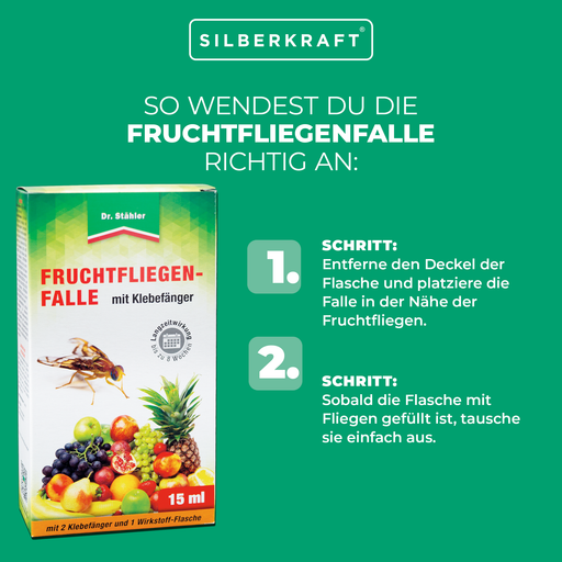 Platziere Silberkraft Fruchtfliegenfallen strategisch in befallenen Bereichen, besonders in der Küche. Alternativ kannst du auch, wie in unserem Blog beschrieben, eine Fruchtfliegenfalle selbst bauen oder auf Gelbtafeln zurückgreifen.